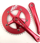 The Sugino 75 cranks are perhaps the best on the market. They have a 170mm crank length and are compatible with a 109mm square-taper bottom bracket and use the 144mm track chainring bolt diameter. We usually carry these in black, silver and some other funky anodoized color. The Messenger cranks come in several colors as well (which we stock) and use the 130mm bolt diameter.
